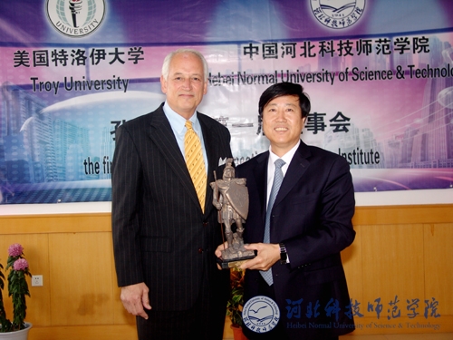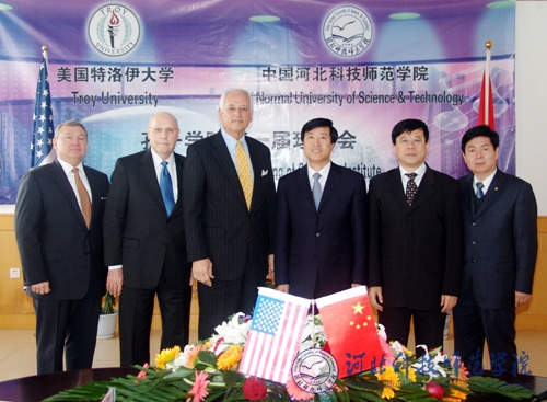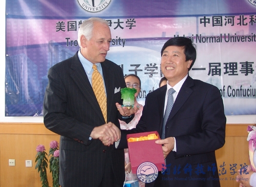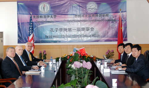 2009年11月6日,我校与美国特洛伊大学合作建立的孔子学院第一届理事会在秦皇岛校区逸夫楼1号会议室召开。美国特洛伊大学校长霍金斯、行政副校长罗奇、副校长英格拉姆、副校长助理波特,孔子学院美方院长徐弘,中国国际青年交流中心副主任阎学谦,我校汤生玲院长、国际合作与交流处李佩国处长出席会议。