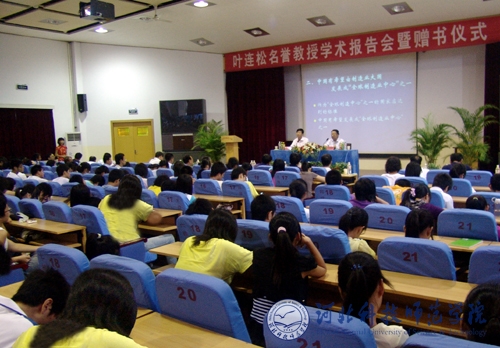 2009年7月11日、13日,我校名誉教授叶连松学术报告会分别在秦皇岛校区学术报告厅和昌黎校区学术报告厅举行。校党委书记石千峰,党委副书记、院长汤生玲,党委副书记陈继生,纪委书记宋绍富出席学术报告会,财经学院与机电工程学院师生1000余人听取了报告。报告会分别由校党委书记石千峰、院长汤生玲主持。
