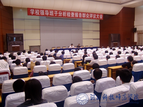 2009年6月19日,学校领导班子分析检查报告群众评议大会在秦皇岛校区学术报告厅召开。校领导石千峰、汤生玲、陈继生、王同坤、宋绍富、孟令臣、房海、刘泽义、杨洪青,院长助理王子茂出席会议。全校中层以上领导干部、正高职以上教职工、党政群团机关各部门正科级干部、民主党派及无党派人士代表、我校省市人大代表和政协委员、部分院(系)学生代表以及离退休教职工代表参加了会议。会议由党委副书记、院长汤生玲同志主持。