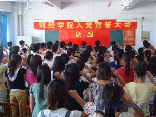 2009年6月25日下午,财经学院在秦皇岛校区逸夫教学楼A709室举行新党员入党宣誓大会。财经学院党委书记张建宗、院长贾圣武、副院长徐祗坤及财经学院党委委员、全体教师、学生党员共200余人参加会议。会议在庄严的《国歌》声中拉开帷幕,贾圣武同志宣读了新党员名单,徐祗坤同志带领全体党员宣誓,张建宗同志做总结讲话,预备党员代表、积极分子代表分别作了发言。