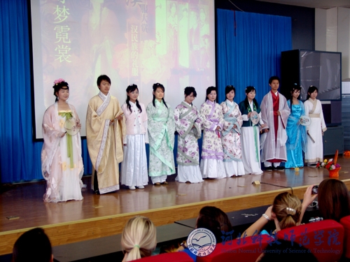 图为来访师生在观看我校文法学院大学生的中国传统文化服饰展演