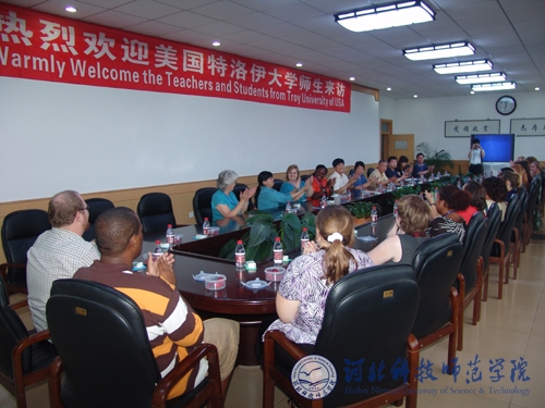 2009年6月30日下午,美国特洛伊大学孔子学院师生一行21人来我校访问。党委书记石千峰、院长汤生玲、副院长房海出席在秦皇岛校区举行的欢迎仪式,并与来访师生交流座谈。教务处处长、国际交流处处长李佩国以及外国语学院师生代表等参加座谈会。