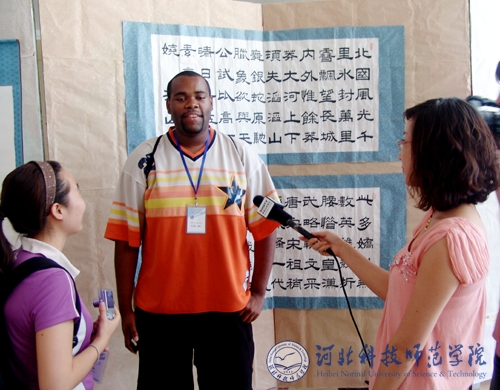 图为来访教师在接受秦皇岛电视台记者采访