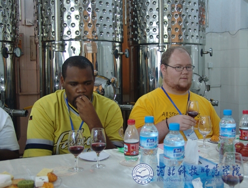 图为来访学子在品尝食品工程系酿造的干红葡萄酒和自制糕点