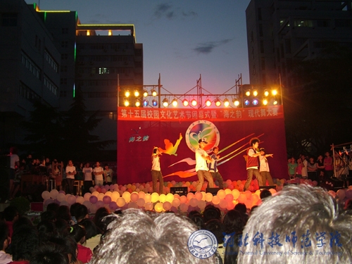 2009年6月12日晚,由校党委学工部、校团委主办,校学生会承办的第十五届校园文化艺术节闭幕式暨第十届“海之韵”现代舞大赛在秦皇岛校区篮球场举办。团市委副书记肖凤利、团市委学少部部长卢玉卓作为嘉宾应邀出席。校党委副书记、院长汤生玲,党委常委、纪委书记宋绍富,党委常委、欧美学院党委书记、院长杨洪青出席闭幕式。火爆的开场舞拉开了“海之韵”现代舞大赛的帷幕。由计算机系代表队带来的《new style 舞点舞分》闪亮登场,动感十足的旋律,激情四射的舞步,赢得了观众热烈的掌声。生命科技学院的《Come back home》将爵士舞与街舞巧妙结合,博得观众阵阵欢呼。欧美学院洛丽塔组合带来的舞蹈突出异域风情,不断引爆观众的热情。工商管理学院代表队的《After school》,以其动感的视觉形象和活力四射的激情舞出了当代大学生的风采。园艺园林系的《Girls on top》,梦魅的舞姿幻化出童话的色彩,星空下狂欢的蓝色精灵带给大家无限的精彩。自由组合TAT的《宇宙先生》表演将本次大赛推向高潮,音乐曲调庄重肃穆,直升机的盘旋、挖掘机的轰鸣仿佛把大家带到了未来宇宙,带来强烈的震撼力,他们隽永飘逸的现代舞步,令观众眼花缭乱,目不暇接。经过激烈的角逐,园艺园林系代表队获得第十届“海之韵”现代舞大赛的冠军,工商管理学院代表队获得亚军,计算机系代表队获得季军。