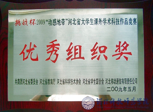 2009年5月27日,“挑战杯”2009“动感地带”河北省大学生课外学术科技作品竞赛在北华航天工业学院落下帷幕。本次竞赛是由共青团河北省委、河北省教育厅、河北省科协、河北省学联、河北移动通信有限责任公司联合主办。
