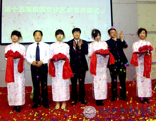 图为团市委书记焦大伟、院长汤生玲、副院长孟令臣为校园文化艺术节剪彩