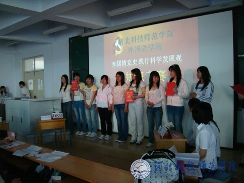 2009年5月7日,外国语学院在开发区校区西阶二室举办“知国情党史,践行科学发展观”主题知识竞赛。竞赛活动旨在通过大学生喜闻乐见的形式,促使同学了解国情党史,掌握科学发展观知识,并以老一辈革命家艰苦创业的精神作为自己的行动指南,自强不息,勇于进取,更好地投身于学业和社会主义建设事业。经过激烈角逐,2008级英语本科代表队获得第一名,07、08意大利语代表队和06、07英语本科代表队分获二三名。外国语学院团总支书记李海英,团总支副书记王文君和周爽、张晓飞、付晓娜老师担任比赛评委,对参赛选手做了精彩点评。