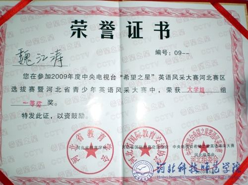 2009年5月1日至3日, 2009年CCTV“希望之星”河北赛区英语风采大赛决赛在石家庄市北方大厦举行,我校外国语学院英语专业2007级本科学生魏江涛同学在全省近600名选手中脱颖而出,获得一等奖。这是他继获得河北省高等学校第十届“世纪之星”英语演讲大赛英语专业组一等奖后获得的又一殊荣。同时,外国语学院教师卞凤莲荣获优秀辅导奖。