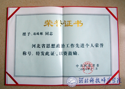 经过河北省第二届思想政治工作先进集体和先进个人评审领导小组评审,我校机电工程学院党委书记冯瑞银同志获河北省第二届思想政治工作先进个人荣誉称号。