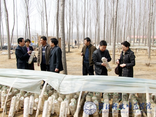 2009年4月8日,科研处处长杨越冬教授与秦皇岛市科技局韩瑞凤副局长、北戴河区科技局张新志局长及我校相关专业教师一行九人到北戴河区戴河镇食用菌养殖基地进行调研。