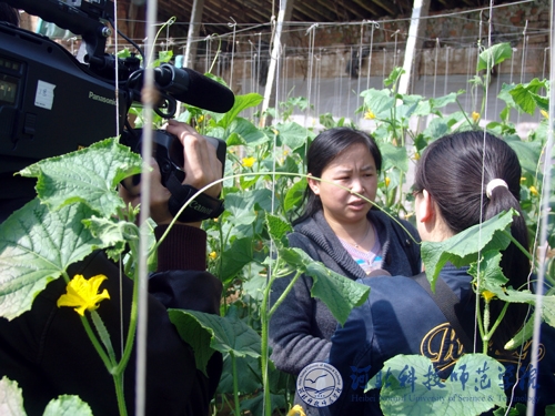 图为闫立英教授在我校“绿岛1号”黄瓜示范基地大棚内接受秦皇岛电视台记者采访