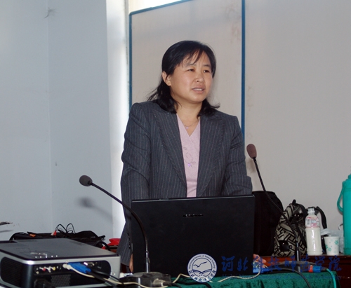 图为闫立英教授在卢龙县刘田庄镇政府会堂内为菜农进行“绿岛1号”黄瓜种植技术培训