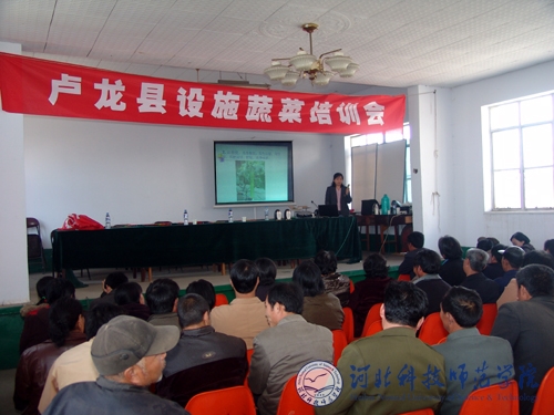 图为闫立英教授在卢龙县刘田庄镇政府会堂内为菜农进行“绿岛1号”种植技术培训