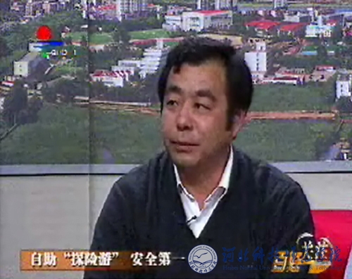 图为体育系主任陈庆合教授在秦皇岛电视台《百姓关注》栏目直播现场谈户外运动安全问题
