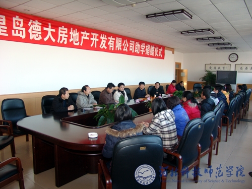 2009年1月9日,秦皇岛德大房地产开发有限公司助学捐赠仪式在我院秦皇岛校区举行。秦皇岛德大房地产开发有限公司副总经理梁剑,学院党委副书记、院长汤生玲,党委副书记陈继生出席捐赠仪式。学工部部长、学生处处长田毅,学工部副部长、团委书记李艳坡,学生处副处长马爱林,相关各系学生工作负责同志,学生处大学生资助工作相关负责同志以及我院11名受助大学生代表参加了捐赠仪式。捐赠仪式由陈继生副书记主持。