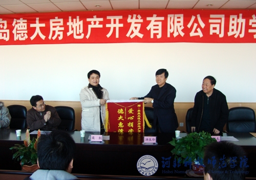 汤生玲院长代表学院向德大房地产开发有限公司赠送了“爱心捐资助学,德大惠泽学子”的锦旗。付华同学代表我院特困大学生在仪式上发言。《秦皇岛日报》等媒体记者现场进行了采访报道。