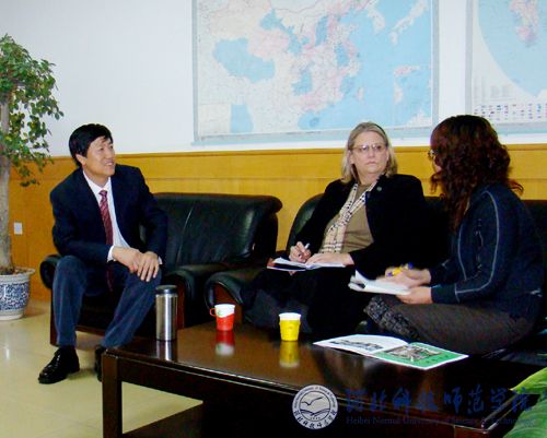 图为汤生玲院长在与孔子学院院长玛丽乔博士洽谈