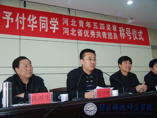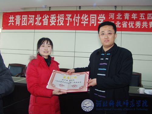 2008年12月14日下午3:00,共青团河北省委在我院秦皇岛校区举行授予付华同学“河北省优秀共青团员、河北青年五四奖章”称号仪式。团省委副书记张泽峰、团省委组织部部长刘洪军、河北省学联主席马东伟、团市委书记焦大伟、团市委副书记肖凤利、院长汤生玲、党委副书记陈继生以及各高校、市直机关的团委书记、相关媒体记者出席了会议,各高校的学生代表参加了会议。