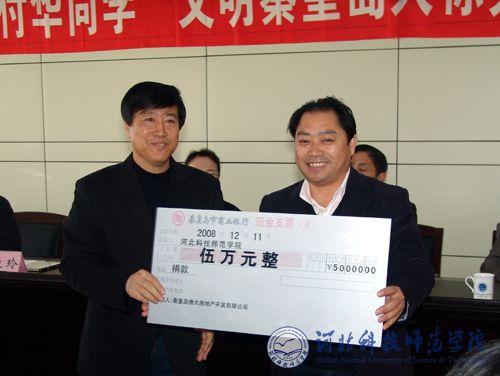 秦皇岛德大房地产开发公司董事长李林忠先生向我院捐赠人民币5万元,用于资助10名象付华一样的优秀贫困大学生。李林忠先生、付华、付华的同学代表先后在仪式上发言。