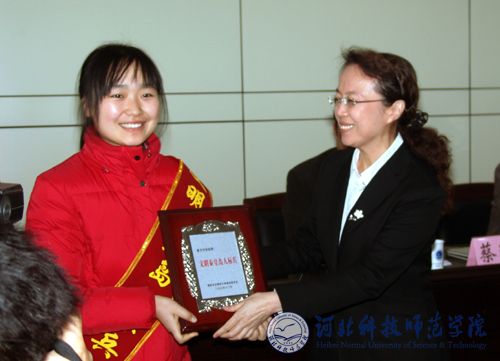 时晓峰部长为付华颁发了“文明秦皇岛人标兵”荣誉证书、奖牌并发表讲话。时部长在讲话中充分肯定了付华母女之间超越血缘的亲情和付华身上所体现出的自强、自立、自尊品格与感恩、孝顺等优秀传统美德,同时也充分肯定了我院在资助帮扶付华同学,树立感恩、自强优秀典范,以人为本塑造人才方面的做法和成绩,充分肯定了德大地产的资助义举和新闻媒体在付华事迹报道中发挥的积极作用。时部长号召全市青年乃至全体市民多了解付华的事迹,进而学习和弘扬在付华身上所体现出的良好品质,借助付华的典型事例,把创建文明城市、创建宜居、宜业、宜游城市活动不断引向深入。