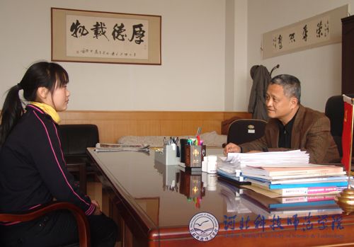 石千峰书记对王明浩主任一行来我院进行采访报道表示热烈欢迎,他简要介绍了付华同学感恩自强的成长经历,同时也介绍了我院对付华同学给予的资助工作以及在学院内深入开展学习付华同学感恩自强,乐观进取的优秀品质的活动情况。随后,石千峰书记又亲切会见了付华同学,热情询问了她近期的思想、学习和生活状况,从四个方面总结了付华同学优秀品德和素质:直面人生逆境;勇于承担责任;体现道德良知;塑造优秀自我。石书记勉励付华要认识到从前战胜生活困境只是人生的第一步,要继续保持乐观和阳光的心态,走好今后的人生之路;要用自己的品质和言行去影响和带动周围的其他同学,共同健康成长;要弘扬道德良知,把感恩养母、恪尽孝道的朴素情感升华为感恩大爱,爱党爱国的思想感情;要励志奋发成才,在学习、工作、生活各方面不断进步,成为对社会有用的人才。