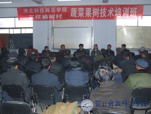 图为我院在青龙县三杈榆树村举办蔬菜果树技术培训班会场