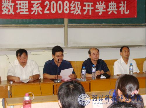 2008年9月18日下午,我校数理系在秦皇岛校区逸夫教学楼B104组织开展了2008级新生入学教育活动。数理系党总支副书记、副主任贠小波,党总支副书记肖欣,副主任申玉发及各专业带头人、学术带头人、全体教授、博士、各专业教研室主任、副主任、科级干部、部分教师代表及137名新生参加了数理系2008级新生开学典礼仪式。