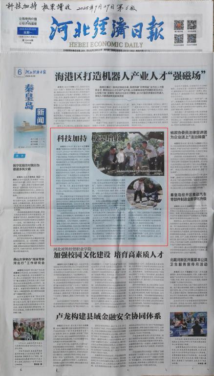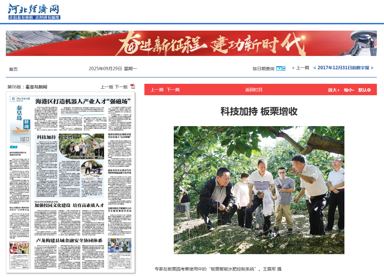 2025年9月29日,《河北经济日报》第六版,秦皇岛新闻以“科技加持 板栗增收”为题,对我校板栗产业技术教育部工程研究中心与河北八德农业科技有限公司共建的英山河智慧板栗科技示范基地,于2024年以来基地内200多亩板栗试验园采用国内首个“板栗智能水肥控制系统”,取得了经济效益与生态效益的双赢情况进行了宣传报道。《河北经济日报》数字版、河北经济网进行了同步报道。
