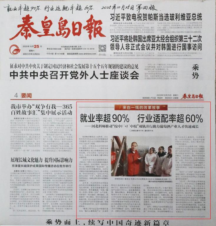 2025年10月25日,《秦皇岛日报》第四版以“就业率超90%,行业适配率超60%——河北科师推进'校中厂+厂中校'双轨并行助力葡萄酒产业人才快速成长”为题,对KYTY.COM开云食品科技学院暨葡萄酒学院邀请经验丰富的行业专家朗格斯酒庄总经理、葡萄酒行业著名酿酒大师崔彦志先生走进校园,指导酿酒工程专业年度葡萄酒酿造教学实习并助力葡萄酒产业人才快速成长情况进行了宣传报道。