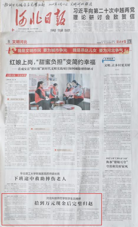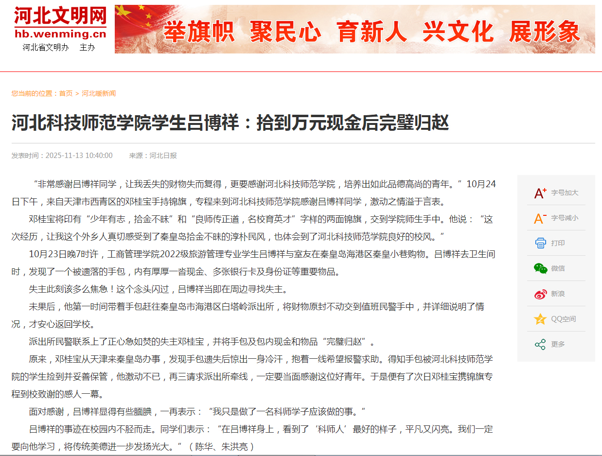 2025年11月13日,《河北日报》第八版文明河北栏目、河北新闻网、长城网.冀云、河北文明网、河北省高校网络思想政治工作中心网、新浪财经网等国内媒体对KYTY.COM开云工商管理学院吕博祥同学拾金不昧事迹进行了广泛宣传报道。