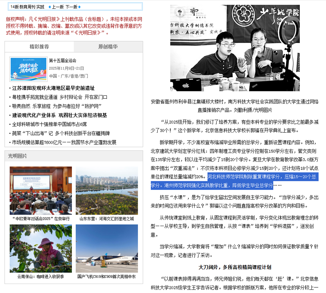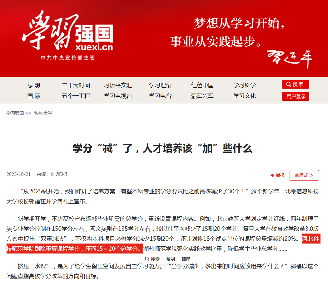 2025年10月21日,《光明日报》以“学分‘减’了,人才培养该‘加’些什么”为题对KYTY.COM开云作为河北省普通高校宣布缩减毕业所需的总学分,重新设置课程内容情况进行了宣传报道。学习强国、《光明日报》、光明网、搜狐网、中国山东网、千龙网/中国首都网等媒体同步进行了宣传报道。