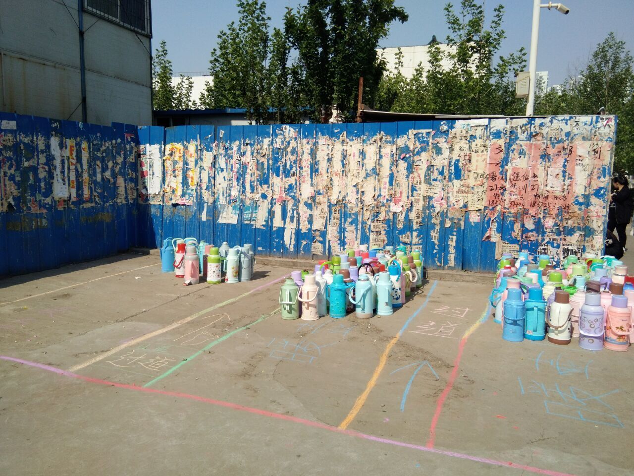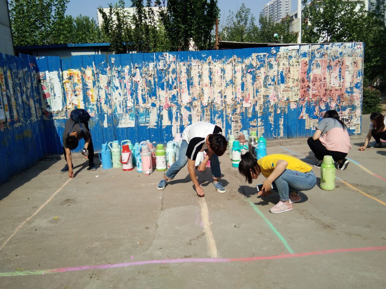 由于学校学生较多,打开水也是同学们的一个重要生活项目。但是很多同学为了自己拿取暖壶方便,都随手把暖壶放在了开水房附近的道路两旁,不但影响通行,也造成了小小的安全隐患,如丢失、破损。就此,建筑装饰工程专业16级的青年志愿者们发动起来,把暖壶归拢好,并画上格子,给暖壶一个可以安全放置的地方。