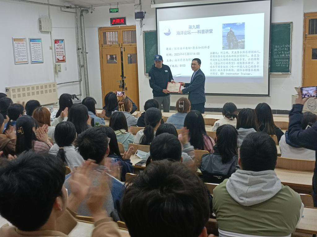 何志鹏是秦皇岛地区潜水领域的专家,学院特聘其为学院校外辅导员,学院主管学生工作领导为他颁发了聘书。讲座中,何教官用亲身经历,带领同学们了解了潜水过程中发生的物理变化、身体的生理变化,还与同学们分享了海洋生物保护知识及水中拍摄的海洋生物照片。在何教官的生动讲解下,同学们掌握了初级潜水知识,加强了对海洋生物的认识,提高了海洋环境保护意识,受益匪浅。