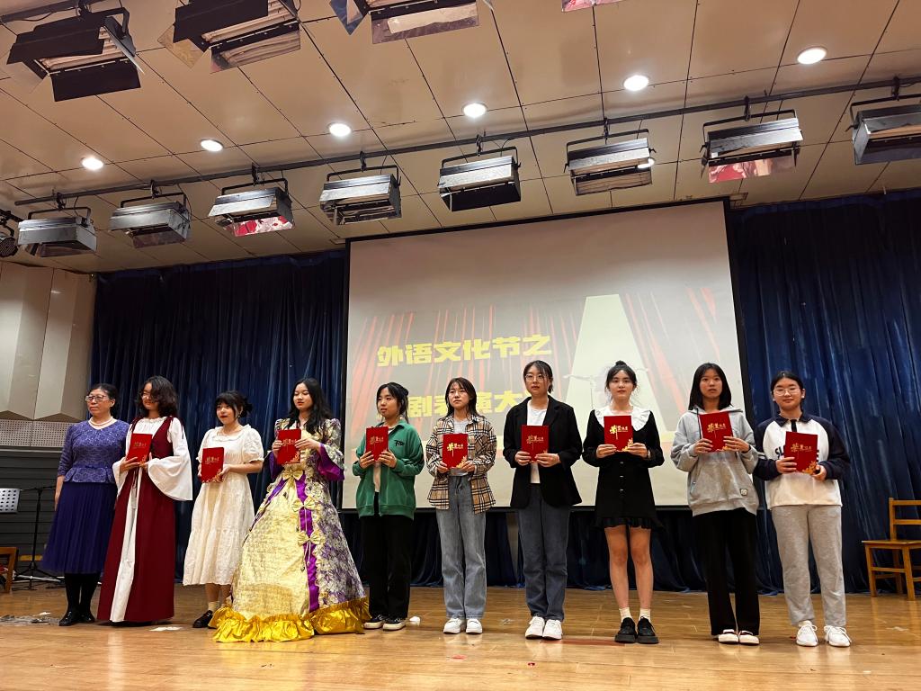 本次比赛共有9组选手参与。选手们通过戏剧表演与人物塑造,展现人情的美好与温暖。参赛选手表演的剧目选材丰富,既有服饰华丽独特的Cinderella、音乐欢快动人的King Lear、情节扣人心弦的The Million Pounds,也有与心灵相遇的Out of The Truman’s World、与浪漫邂逅的《罗密欧与朱丽叶》等等,选手们在舞台上动情演绎,仿佛穿越时空与所演绎的人物形象重叠,为在场观众呈现了外语与戏剧、艺术与青春相融合的文化之美。经过激烈的比拼,评委老师现场打分,The Million Pounds与Out of The Truman’s World荣获一等奖,《罗密欧与朱丽叶》荣获二等奖,King Lear等三组荣获三等奖,The Shirt of a Happy Girl等组荣获优秀奖。(编辑:孙艳敏 审核:彭妍)