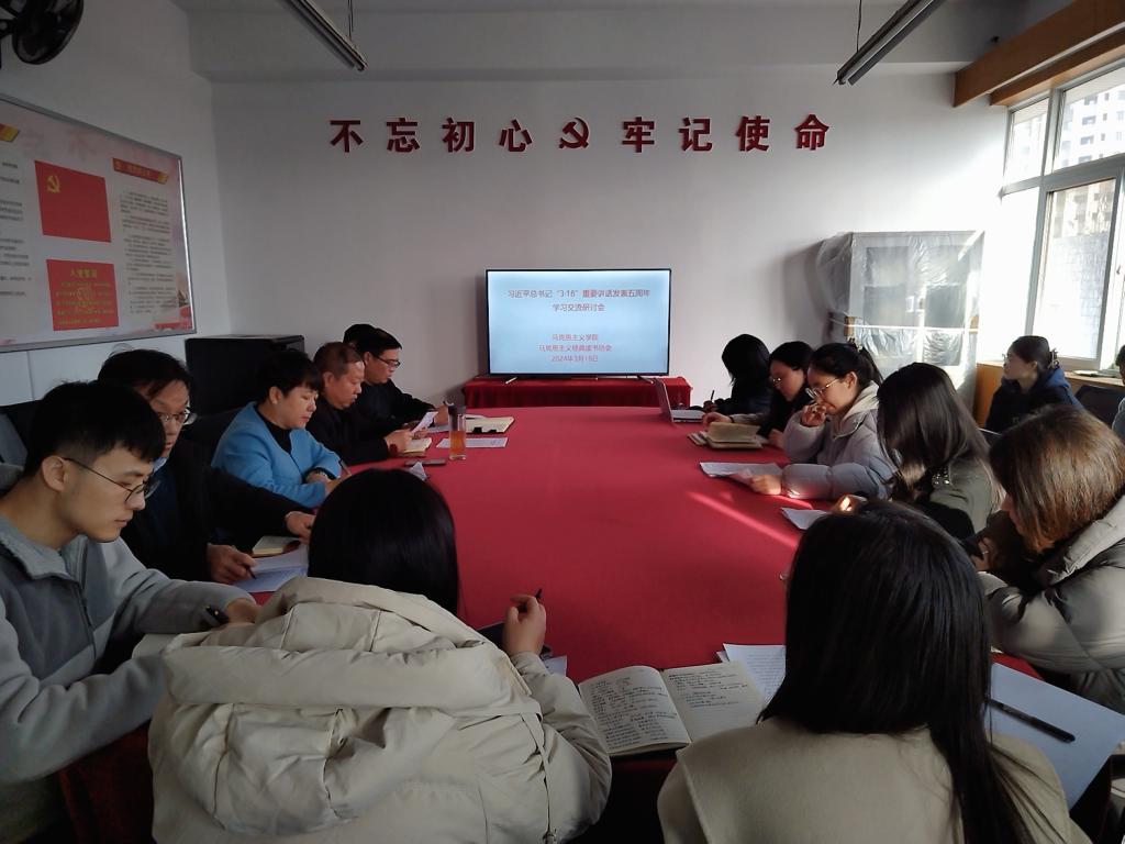 2024年3月18日,正值习近平总书记“3·18”重要讲话发表五周年之际,马克思主义学院召开学习交流研讨会,重温了习近平总书记在学校思想政治理论课教师座谈会上的重要讲话精神,畅谈了五年来思想政治理论课改革创新取得的成果。学院领导班子成员及青年教师代表参加了研讨会。