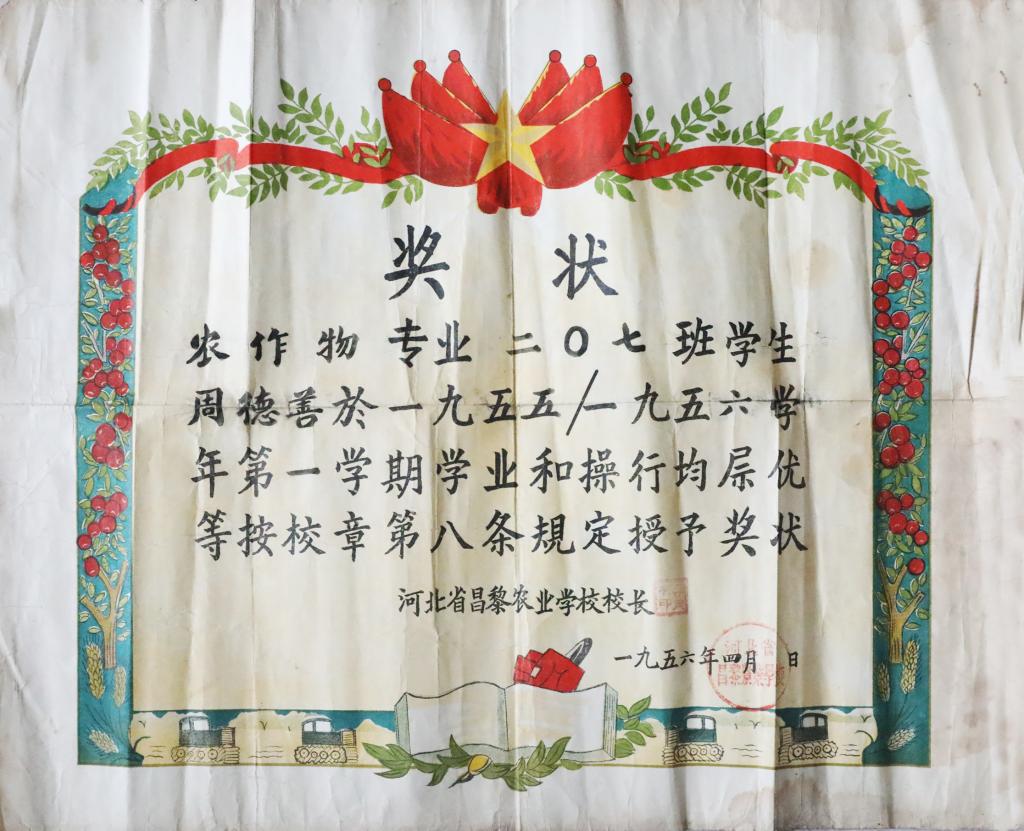 据周德善长孙周立亭介绍,多年来,周立亭将爷爷周德善的荣誉奖状倍加珍惜,精心收藏至今并捐赠给学校。周德善之子周树星,1958年生人,1977年国家恢复高考后第一批考入我校的本科生。周德善和周树星父子同为我校校友,农业专家,周树星子承父业,毕业后在农业领域大展作为,父子俩在不同年代为唐山市乐亭县农林业发展做出了突出贡献。(待续)
