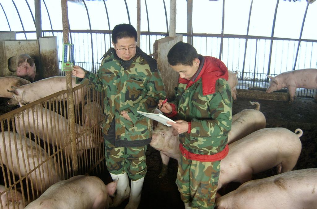 马增军教授(左)带领学生在猪场开展科研活动