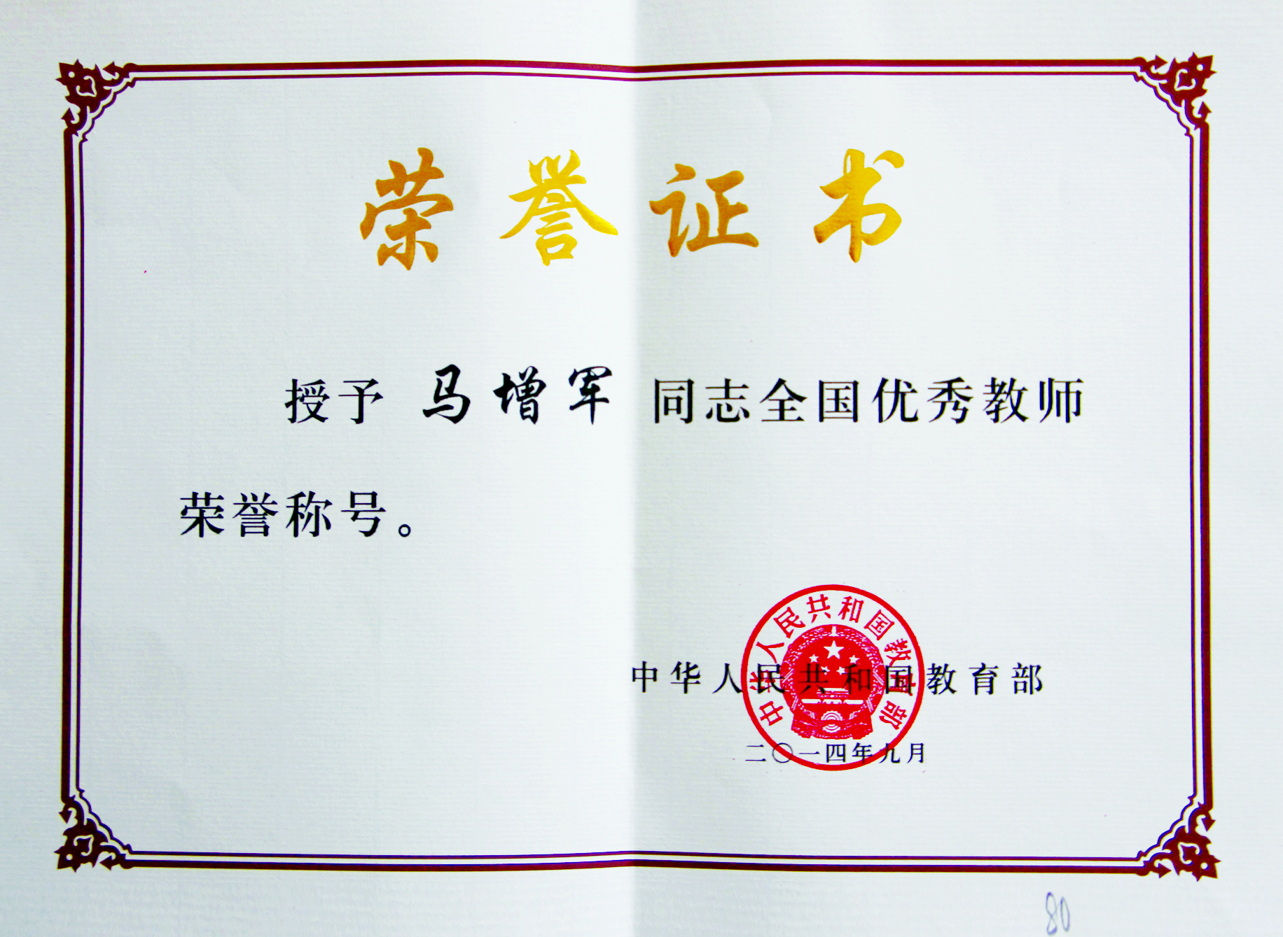 2014年9月马增军教授被国家教育部授予全国优秀教师荣誉称号