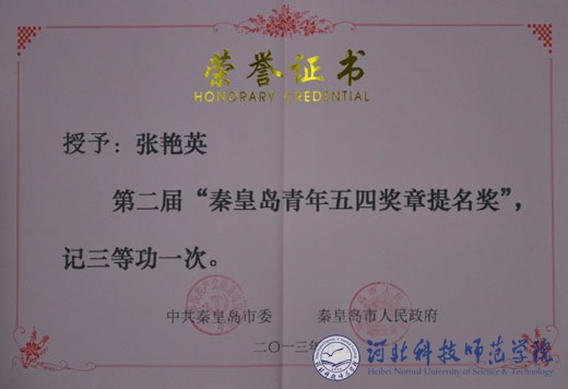 近日,在第二届“秦皇岛青年五四奖章”评选活动中,我校动物科技学院张艳英老师获得“秦皇岛青年五四奖章提名奖”并记三等功一次。(编辑:李民 审稿:赵建平)