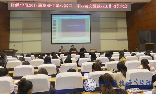 2013年10月29日下午,财经学院召开2014届毕业生毕业实习、毕业论文暨就业工作动员大会。学院党委书记张建宗、院长贾圣武、副院长杜茂宝出席动员大会。教学部主任、学工办辅导员、任课教师以及2014届毕业生共300余人参加了大会。会议由副院长杜茂宝主持。