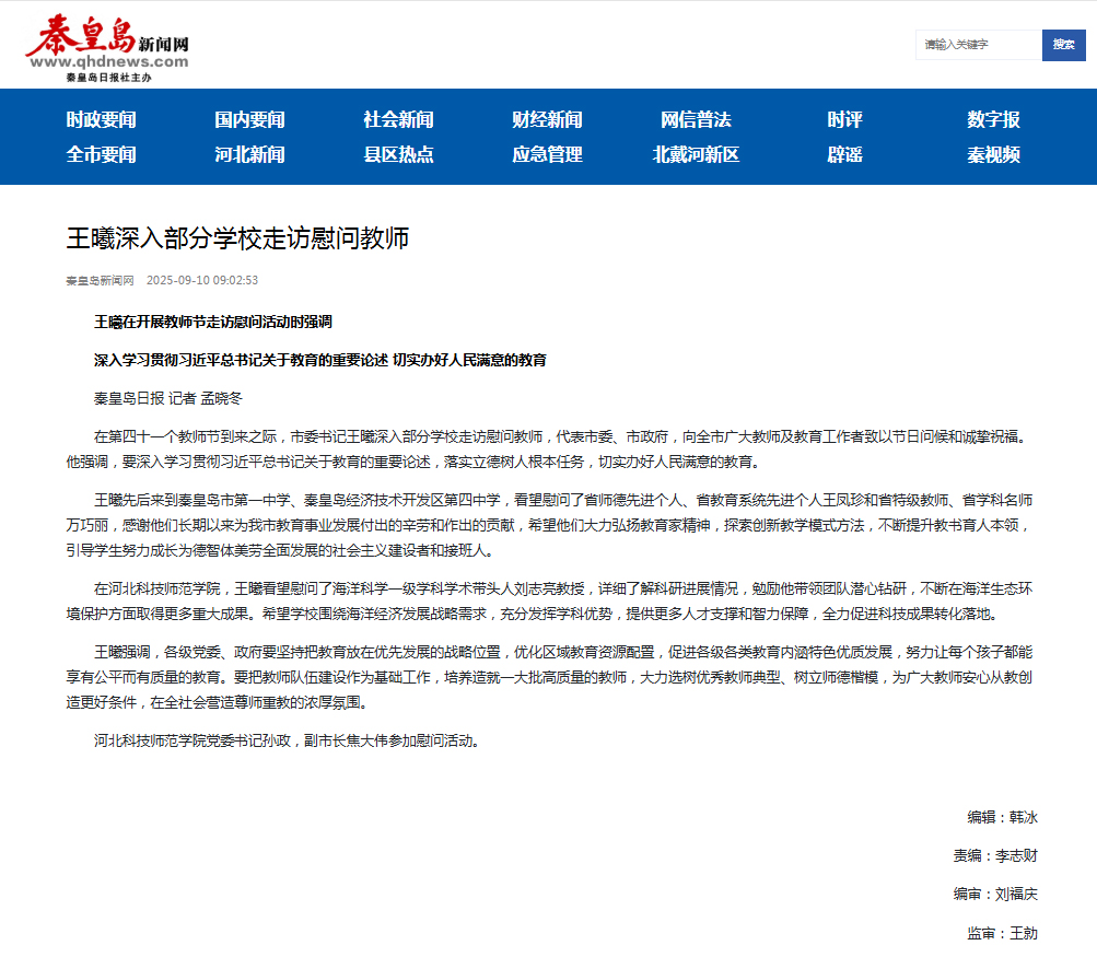 2025年9月10日,秦皇岛新闻网以王曦深入部分学校走访慰问教师为题,对秦皇岛市委书记王曦深入我校走访慰问海洋科技研究中心刘志亮情况进行了宣传报道。今日头条网进行了同步报道。