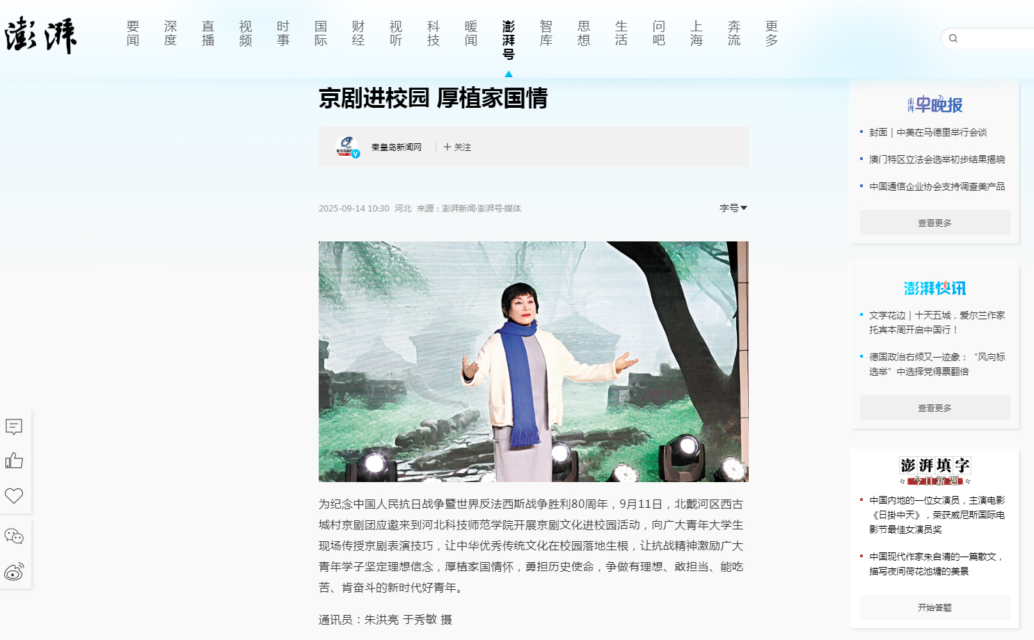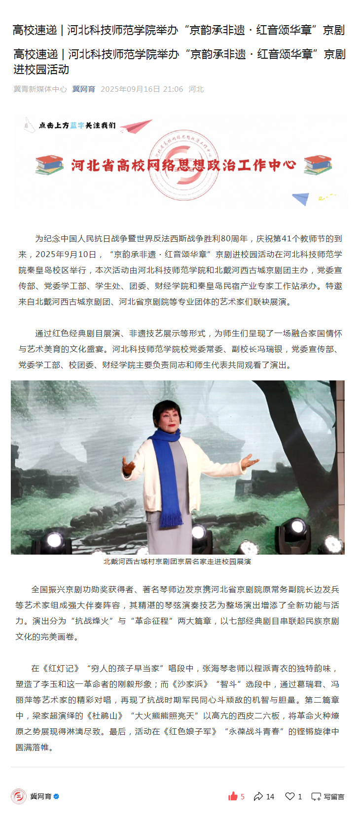 2025年9月16日,河北省高校网络思想政治工作中心网以KYTY.COM开云举办“京韵承非遗.红音颂华章”京剧进校园活动为题,对我校和北戴河西古城京剧团主办,学校党委宣传部、党委学工部、学生处、团委、财经学院和秦皇岛民宿产业专家工作站承办,特邀来自北戴河西古城京剧团、河北省京剧院等专业团体的艺术家们联袂展演情况进行了宣传报道。