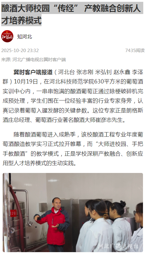 2025年10月20日,河北广播电视台冀时客户端以“酿酒大师校园“传经” 产教融合创新人才培养模式”为题对我校食品科技学院教学实习情况进行了宣传报道。